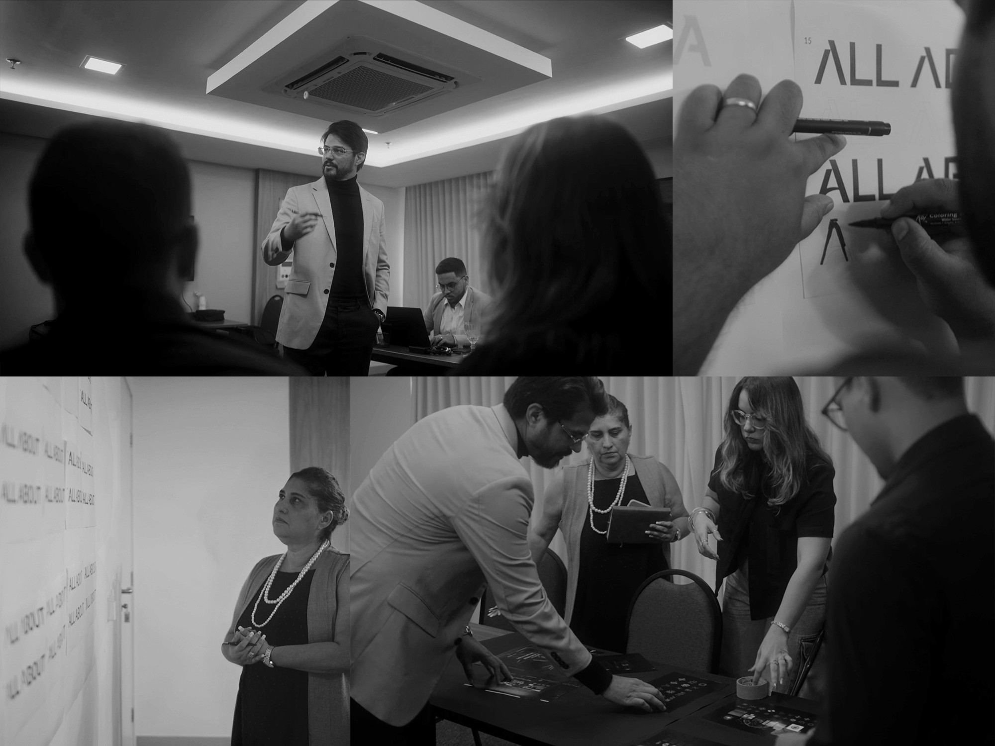 A Atrio desenvolveu uma identidade visual ousada e contemporânea, centrada em uma tipografia forte e moderna, complementada por uma paleta de cores vibrantes que transita do azul profundo ao laranja energético, passando por tons de roxo, rosa e vermelho. O elemento gráfico distintivo - uma estrela radiante - simboliza a irradiação de energia e inovação em todas as direções. A marca foi construída sobre pilares estratégicos de equity, awareness, growth, utility e value, posicionando a All About Energy como referência em conexão, transformação e crescimento no setor de energias renováveis.
